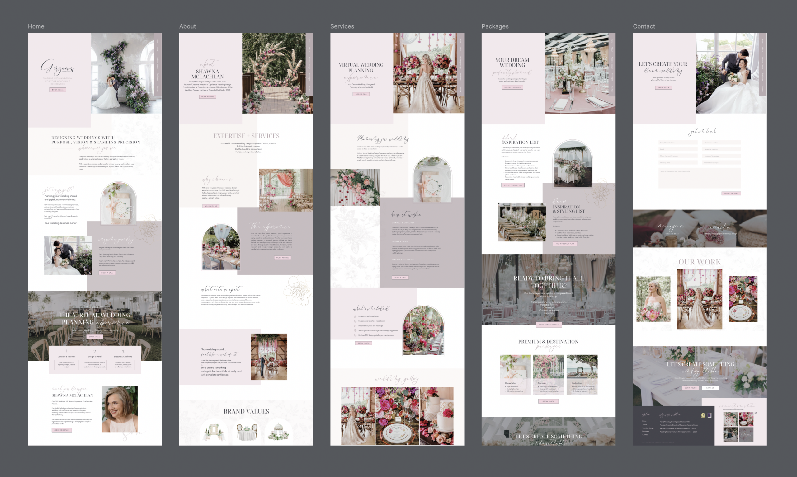 The Gorgeous Weddings website includes several key pages designed to guide visitors naturally through the brand experience.